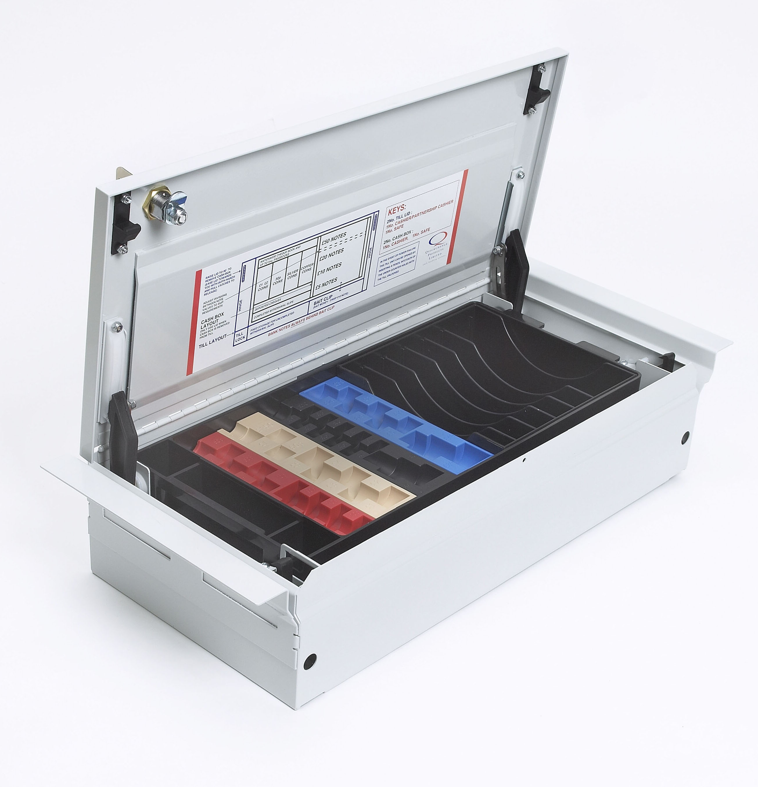 Originally developed for the Nationwide Building Society, our high quality Flip Tills have since become popular with a number of organisations where safety and security is a priority and cashier working space is at a premium. Easy to install, the Flip Till drops neatly into the counter and sits flush with the surface. Each till is supplied complete with a bespoke inner cash box which is lockable and also removable. This enables individual cashiers to be responsible for their own transactions and also facilitates quicker staff changeovers. Also supplied is a push button release and power pack to operate the till.